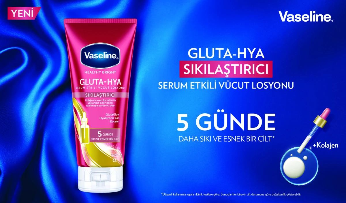 İçeriğindeki hyalüronik asit ile kuru cildinizi derinlemesine nemlendirirken Glutaglow teknolojisi sayesinde parlaklık sağlarken yaşlanma belirtilerini azaltmaya destek oluyor. Vaseline® Gluta-Hya Sıkılaştırıcı Serum Etkili Losyon kolajenle zenginleştirilmiş formülüyle cilde doldunluk veriyor ve cildin esnekliğini arttırıyor. Düzenli kullanımda ise yalnızca 5 günde cilde daha sıkı ve esnek bir görünüm kazandırıyor.